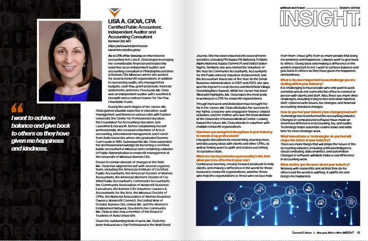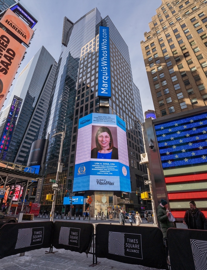 KANSAS CITY, MO, February 07, 2025 /24-7PressRelease/ — Lisa A. Gioia, CPA, is a distinguished biographee of Marquis Who’s Who. She was recently spotlighted in New York City’s Times Square on a 22-story screen that is passed by an estimated 1.5 million people daily. As in all Marquis Who’s Who biographical volumes, individuals profiled are chosen from among a pool of the most prominent professionals and are selected on the basis of current reference value. Factors such as position, noteworthy accomplishments, visibility, and prominence in a field are all taken into account during the selection process.
